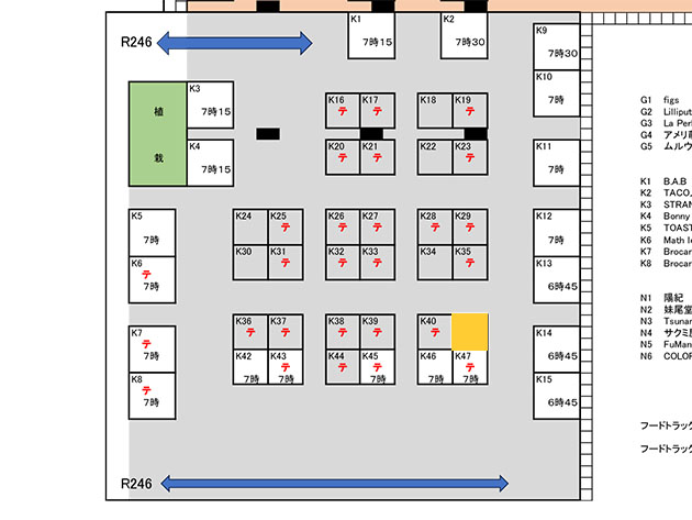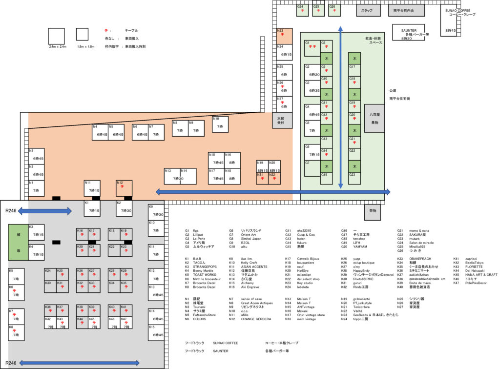 会場案内図です。マップ左側が246からの入り口で、当店はマップグレーのゾーンで拡大図黄色のブースにおります。